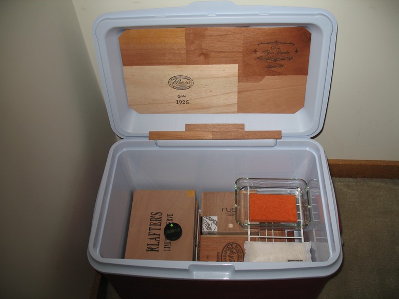 Boxes aren't the only option. I've also seen various plastic baskets used for singles storage. Cedar pieces or sheets can be attached to the lid of the coolidor with double stick tape. I used 3M molding tape since it was in the shop. As already stated the cedar isn't a necessity, but I got some sheets and blocks for free. The blocks are set that way on the lid because there was a small gap where the lid hinges. Nothing that I worry about but the blocks do seem to help humidity stability. The white racks are cupboard organizers. The large one covers the entire bottom with more cedar sheets and a few blocks below it. Don't mind the sponge thing as this is an old pic from when I first put the coolidor together. Attachment 7089 (click to enlarge) |