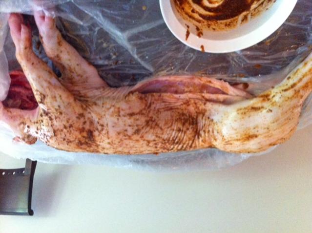 I injected it with Jim Beam Bourbon and put a liberal amount of spices/bourbon and applesauce in the chest cavity. Tomorrow I'm filling it with apples/onions/garlic/appleauce and more rub. I'll be smoking it for around 10 hours. To the best of my knowledge about 20 minutes a pound at 225. Attachment 10127 I've got a nice Cigar collection picked for the day. Romeo & Julieta #4 Cohiba Singilo IV Montecristo #4 i also have a few back ups for later in the night... Tomorrow should be epic. :banger |
