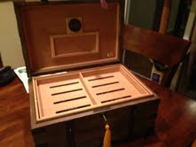 That's a nice looking humi you got there! I have the same one, just a different design on the outside. It's been very reliable. I have found however, that if you just use the rectangular humidifier on the lid, it can have trouble permeating though to the second layer. I also keep a Boveda packet or two underneath to ensure the humidity stays the same in the entire humidor. Just make sure it's not in direct contact with your sticks! I would also STRONGLY advise keeping the Kuba Kubas and other infused cigars OUT of the humidor. It will definitely affect the flavor of the others. An airtight tuperwear will work wonders. That flavor can linger for long, long time even after you've smoked the infused cigars. |
