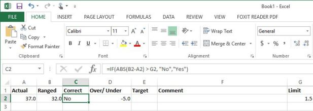=IF((ABS(B1-A1)>1.5), "FALSE", "TRUE") The literals could also be changed to PASS/FAIL, YES/NO, etc. |