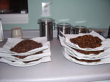 First off I usually seperate out the tobacco that I want to jar into equal amounts. In this case it was from a full pound so I wanted to seperate it into 4 equal amounts of 4 ounces. I just weighed it out on a kitchen scale that I have and placed it on paper towels on top of plates. That way I wouldn't have to wash the plates afterwards. I'm lazy like that.