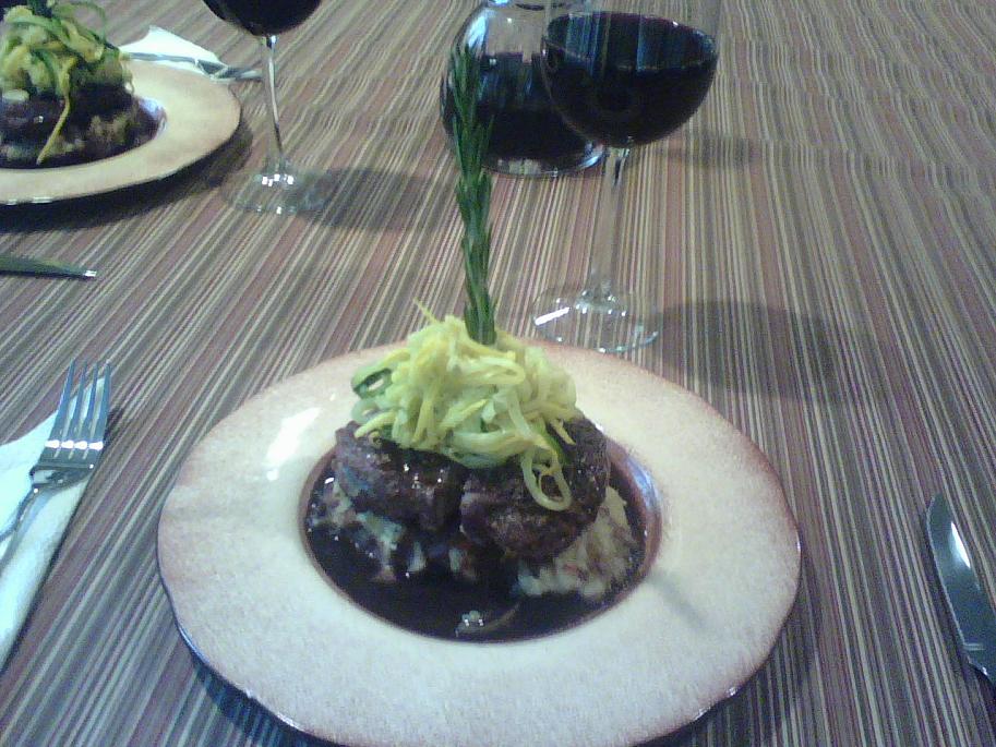 Grilled filet mignon over a herbed boursin (a type of soft cheese), lobster and porcini mashed potato cake with yellow and green squash "ribbons" on top with a Porcini, rosemary Cabernet reduction. It was GOOOOOOOOD. Topped it off with a 1999 Michel Schlumberger Cabernet Sauvignon. Yum! Might end tonight with a Padron 40th anni Maduro. Try this one guys, you will love it. |