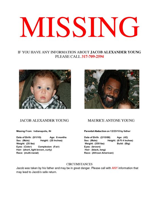 I attend a class with a group each Sunday after our regular service and became somewhat acquainted with a couple that recently started coming. On Dec. 23rd, the father took their 8 month old child from Indy and has been gone ever since. He's been seen in Nashville/Atlanta and it's believed that he may have gone to Florida as well.