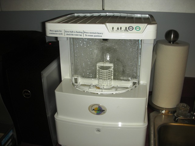 Works great. Put a cup on the carosel, push the button, it roates 180 degrees, does its laser wash thing rinse, soap, rinse, then rotates back out the clean cup.