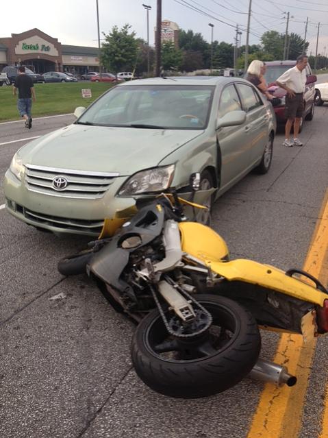 The bike was already down when the car was hit, at least from what I can tell from the picture; however, there are no pavement scrape marks at the bike or elsewhere in the pic as far as I can tell. Without a wider shot, it is difficult to make a call. It is likely that this is a single vehicle accident wherein the result was a secondary collision with a car. The accident report might be well worth reading. The statistics on motorcycle accidents (you can find them on the NHTSA website) are overwhelmingly single vehicle accidents or accidents where the motorcyclist is at fault; e.g., apex too early, too hot and losing control. The largest car/motorcycle area where the motorcyclist is not at fault is where cars turn in front of an oncoming motorcycle; they misjudge the distance because they expect cars and "see" the motorcycle as being a car farther away, or they don't see the motorcycle because they are only expecting to "see" cars. The crash statistics for western Europe are most interesting. While I've only seen presentations on those statistics and not seen the raw data, it seems that incidents of cars not seeing motorcycles is substantially lower than here. Of course, the percentage of the population that rides either motorcycles or scooters is much higher as well. Yes, it is true that I used to be a technical reviewer for the NHTSA conferences on motorcycle safety. As Adam said, some riders give motorcyclists a bad name / image. In the safety game, we tell motorcyclists to watch out when they see such behavior because the angry driver may not be able to take it out on the person who made them angry but they can take it out on you. You are the smallest thing on the freeway, so don't get an attitude. Don't forget, every rider is an idiot on two wheels and every cager is a homicidal maniac. But I'd never stereotype. At the end of the day, it is your job (car or bike) to be as safe as you can within the tolerances of the risks that you are willing to take. Sometimes that is not good enough, but being mindful can reduce those "sometimes".