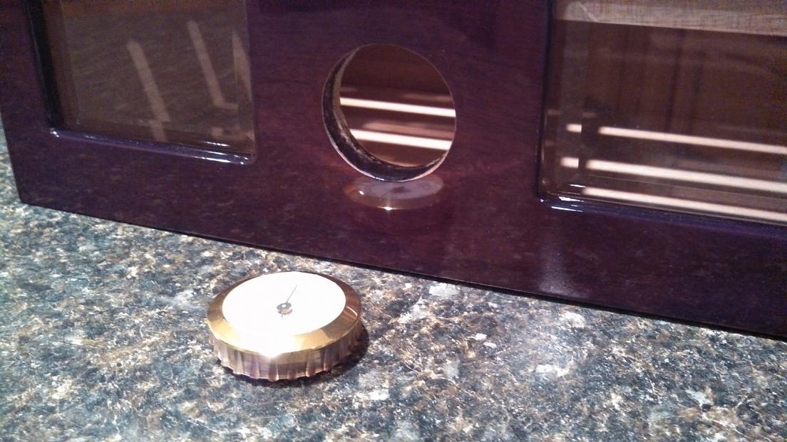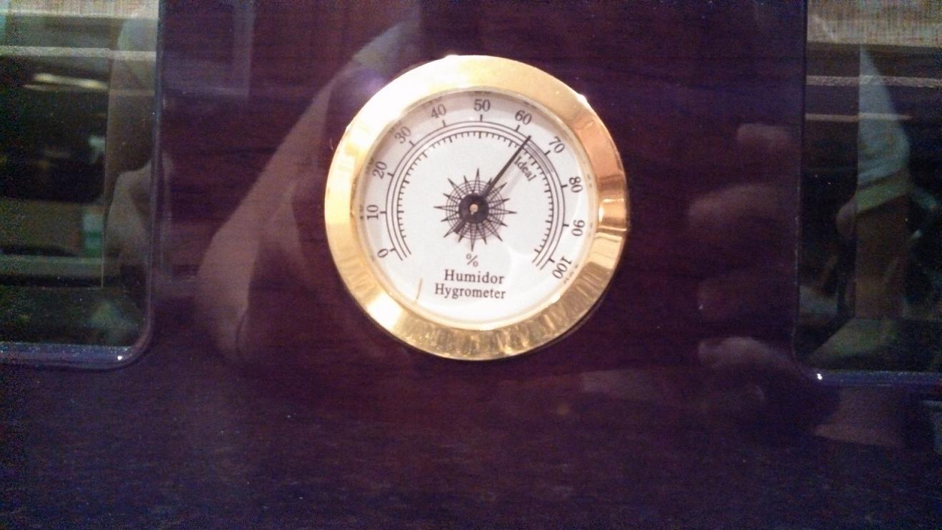 Ironically the spot that needle was sitting at is the perfect range to store cigars at. You could probably just put a bead of silicone and set that hygrometer right in place.
