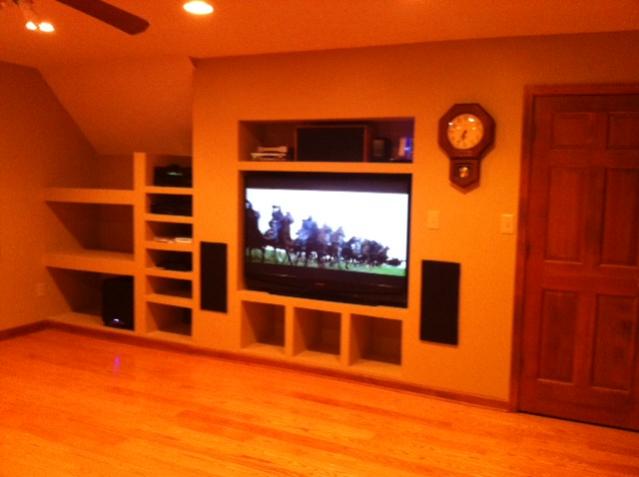 Work included replacing the carpet with new paint, new hardwood floor, built-in recessed entertainment center replacing closet and corner space, and installation of 6 new recessed can lights.