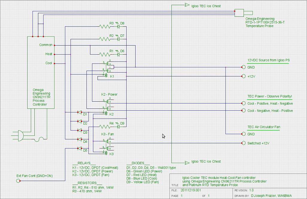 However, soon I was wondering if I really *was* finished since I'd been thinking of some sort of temperature control using the built in TEC unit. The closer summer got, the more important it sounded to me. No worries, I thought, I'm an electronics guy, I can completely roll my own controller if I want. Soon though, I found a brand new, normally expensive process controller for cheap on eBay; normally costing around $330, I snatched it up for a mere $35. Then I ordered a matching temperature probe from the controller's manufacturer ($38), so for a cash outlay of only $73, I was ready to very accurately control the temperature of my new Igloodor. The controller and the temperature probe are made by Omega Engineering, a name well known in the process control field; I've been using their stuff on various projects for the last 25 years or so. With the necessary control parts now on hand, all that was needed to complete the project were a few odds and ends collected over the years that were presently collecting dust in my junk box and the ambition to get off my lazy butt and do it. I dug out three old Radio Shack relays, a few 1N4001 diodes for control line isolation, a power cord, and a fuse holder to complete the unit. But with no spare room in the Igloodor to mount the control stuff, what to use for a electronics case? Then an epiphany hit while smoking a 601 Blue; what, I mused, would be more appropriate than using an empty cigar box? Perfect! Thus the controller was begun. A little head scratching, some elbow grease, and a couple burned fingers later, I finally have my completed controller - one that controls both cooling *and* heating, that's accurate to within about one degree, and that can maintain the temperature to within 0.1 degrees of set point if desired! Overkill? Definately! But awesome cool (pun intended) so I did it anyway! But, you ask, how can a mere "cooler" regulate both the high and low temperatures? Easy - a TEC is really a semiconductor heat pump that sucks heat out of the cold (source) side and moves it to the hot (sink) side, which also must dissipate the TEC's own operating heat. That's why good heat sinks are a must for both sides of the TEC and fans should be used, too, especially in our application to heat and cool the inside of our Igloodor and all our nice cigars too. The great thing about such a semiconductor heat pump is that when the supply voltage applied to the TEC has it's polarity reversed, the source and sink sides swap too; cool becomes hot and vice-versa! Therefore it's relatively simple to use the TEC as both a cooler and a heater since all that's needed is some sort of polarity reversal device - that's a relay in this design. There's not much else to say here except that point to point wiring was used to construct the project. Safe construction techniques must be used on the mains (120VAC) power side for the Omega controller. Also various control parameters need to be set properly to use the Omega controller for this task. If there's interest, I'll add to this thread post later and let you know which control parameters were set and what they were set to. In case anyone is interested, here's a higher resolution version of the schematic presented with the pictures of the complete unit in the Igloodor photo album: IgloodorSchem.jpg and here's a link to the album itself: Igloodor Finally, the unit keeps temperature controlled flawlessly, and with the inclusion of several 4 ounce bags of HCM (Shilala) beads the RH stays right smack-dab at 68% where I want it. So enjoy - I am!