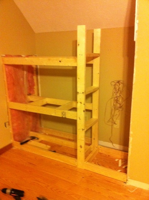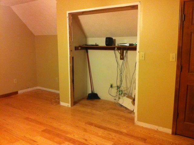 So, the hardwood floor is in and To make the best use of space, I'm going to build in an entertainment center in a closet and build shelving into the corner as well so the entire surface along the wall is flush.