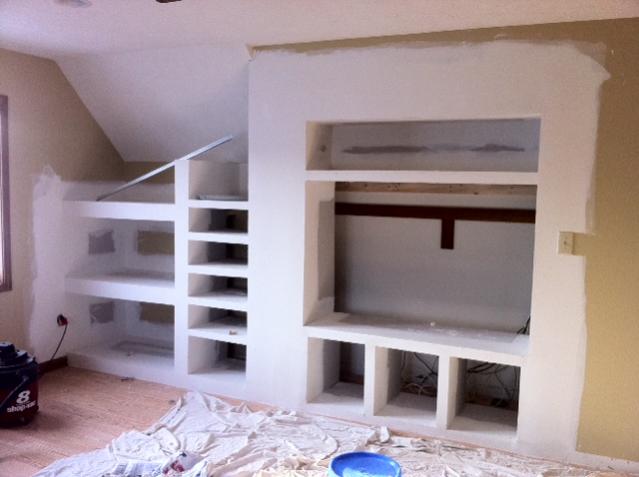 Here's what I tinkered around with today...drywall removal and started framing in the shelves on the left side.