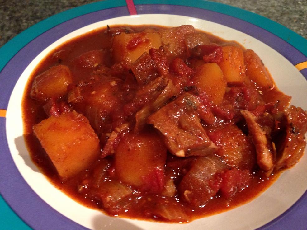 1/2 butternut squash, peeled and cut into 1/2 cubes 1/2 large onion, chopped 3-4 garlic cloves, minced 2 slices bacon, chopped 15oz can chopped tomatoes 1c chicken stock 1.5 tbsp chili powder 1 tsp ground cumin 1/2 tsp Mexican oregano Meat from one cooked turkey leg and wing, shredded and roughly chopped Salt/pepper Over med-low heat, render bacon until almost crispy. Add squash and onion, increase heat to med, sauté to carmelize veggies. Add garlic and sauté for 30 seconds more. Add tomatoes, stock, chili powder, cumin, oregano and turkey meat. Simmer until squash is tender. Add salt/pepper to taste. Enjoy!