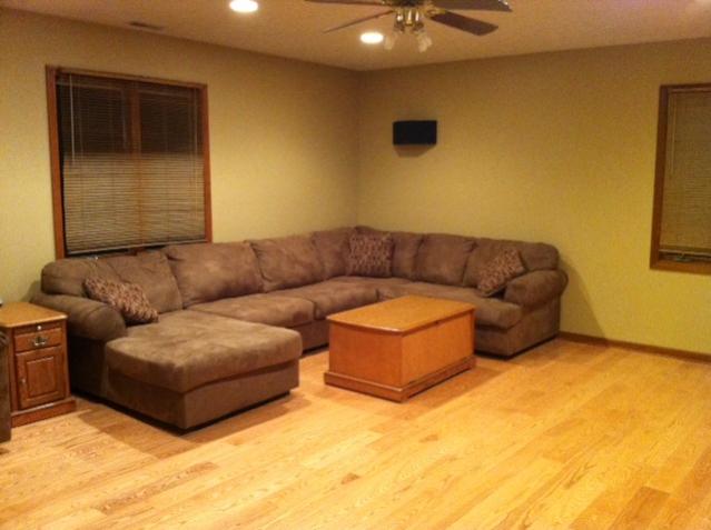 Work included replacing the carpet with new paint, new hardwood floor, built-in recessed entertainment center replacing closet and corner space, and installation of 6 new recessed can lights. I'm really digging it. |