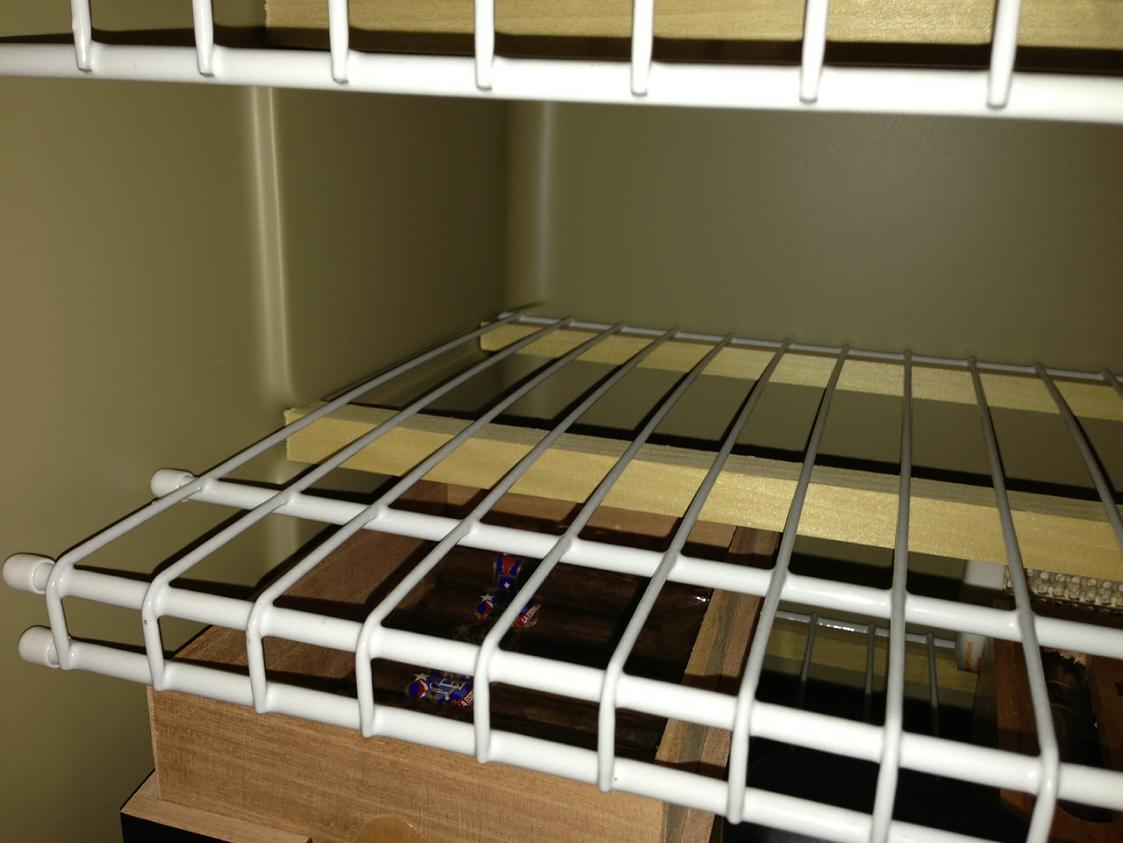 rear dowel (1/2" squared) is 13 15/16" front dowel (5/8" squared) is 14 1/8" rear of shelf cut to 13 3/4" WITHOUT the rubber caps middle of shelf cut to 14 1/4" WITHOUT the rubber caps front of shelf cut to 14 3/8" WITHOUT the rubber caps The front dowel is going to be tight, just press it in so it's snug and won't pop out after giving it a tap or two. Oh, I'm standing it up on top of an old nightstand, and used double-sided tape to keep it from sliding around. |