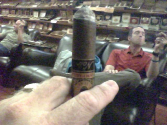 It didn't take long for me to fall in love with this stick. It started out with a spicy, leathery-toasty flavor and quickly transformed into smooth, chocolate-coffee undertones. The smoke had a sweet taste and it didn't stop there. It continued to keep the sweet taste right until the end in which the smoke got a bit stronger with a slight bitter taste. A quick purge eliminated this bitter flavor and it continued to be a good stick until it began to burn my finger. I have added this stick to my collection with a total of 25 so far, which only about 10 are left! The B&M has brought in a total of 4 boxes and 3 are gone! Myself and two other locker members are responsible for the snap ups. I'll be enjoying another tonight over steak with a few of my cigar friends. I highly recommend this stick to any Maduro fans and don't let the dark wrapper fool ya. It's smooth enough for connecticut lovers as well. In the attached pic, I have a shot of my Noir and my buddy in the pic, Dr. D is enjoying one as well.