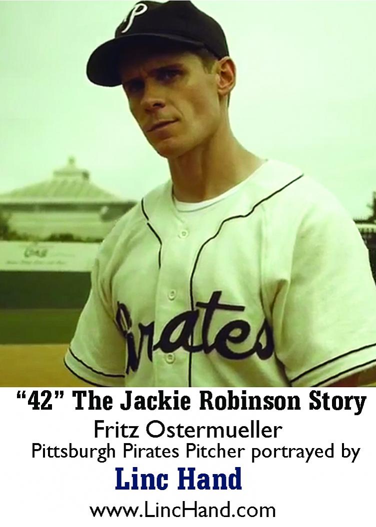 I have a special interest in seeing this movie since a good friend of mine and business associate, Edie Hand, has a son that is playing one of the lead parts in the movie. Linc Hand, who has worked for the Jimmy Kimmel show, doing various skits, is playing the Pirates pitcher that hits Jackie Robinson with a pitch. I hope everyone gets a chance to see this movie. Attached is a pub handout that was thrown together for his opening night: