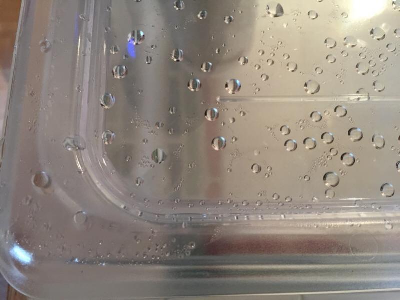 You can see in the pictures below that the condensation does seep out the edge of the lid, but the seepage is very little and more an annoyance than a problem. Overall, I am very happy with this container and I get some exercise carrying the full container (~50 lbs) between the sink and the counter...