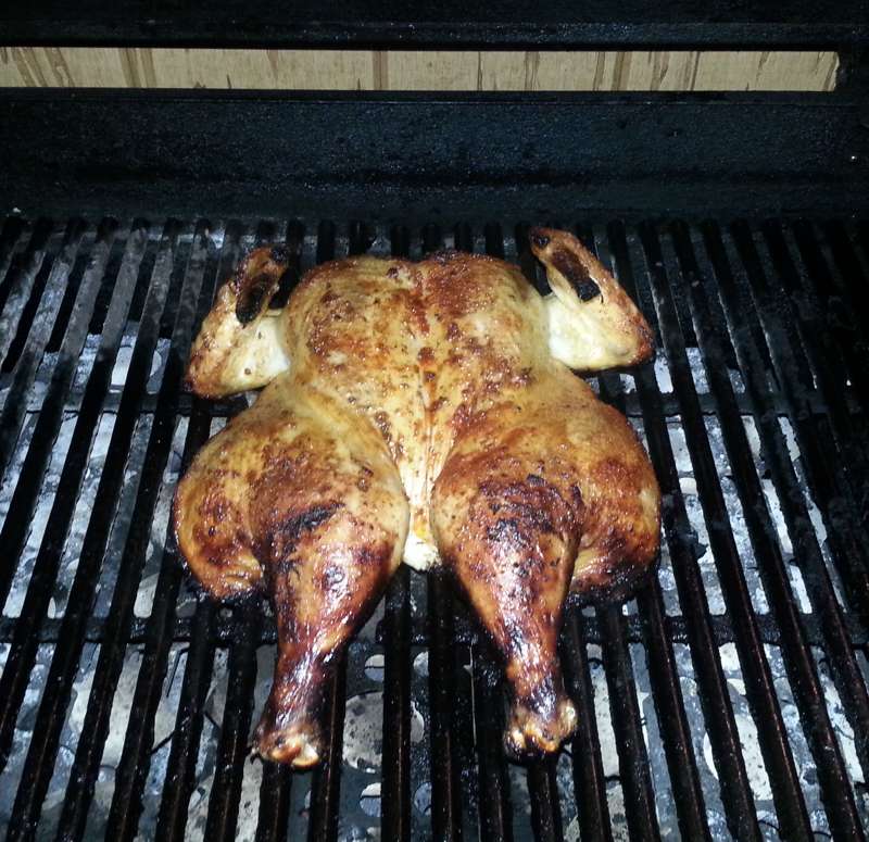 My favorite way to cook chicken when I have to use a gasser. Brined for 4-6 hours then spatchcocked, rubbed and cooked.