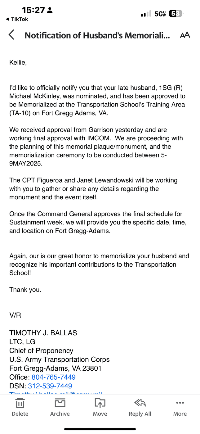 Mac will be honored with a plaque at the US Army Transportation School's training area in Fort Gregg- Adams.
