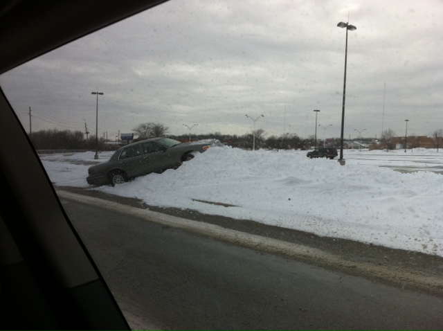 One I just took myself driving through a mall parking lot. The car was sitting on what had to have been a 5' tall pile of snow. Not a great pic, but I just had to take it.