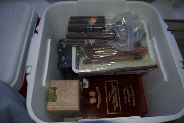I got a box of mixed robustos in there. A box with the Culebras, Box of Louis Martinez Silver Robustos, Camacho 1962 Perfectos, 8 Liberties, a few LFD sets, and a few other coffins up top.