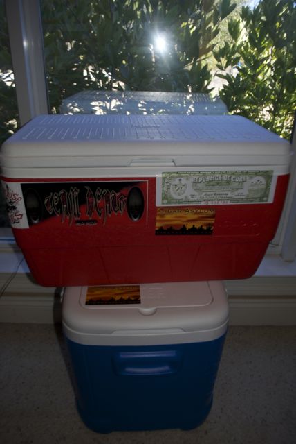 Here are my two Coolerdors. I have a desktop that is sitting empty. The Igloo Ice cube is NC, and the Red Igloo is my CC cooler. I have the active humidification going in the CC cooler. The heat is coming on every now and then. The red igloo cooler just doesn't seem to seal as good as the other.