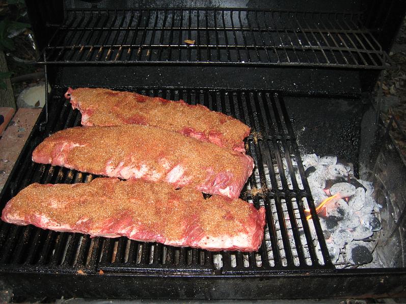 a rack of loin baby back pork ribs. Built a fire of pecan limbs and then covered the coals with charcoal.