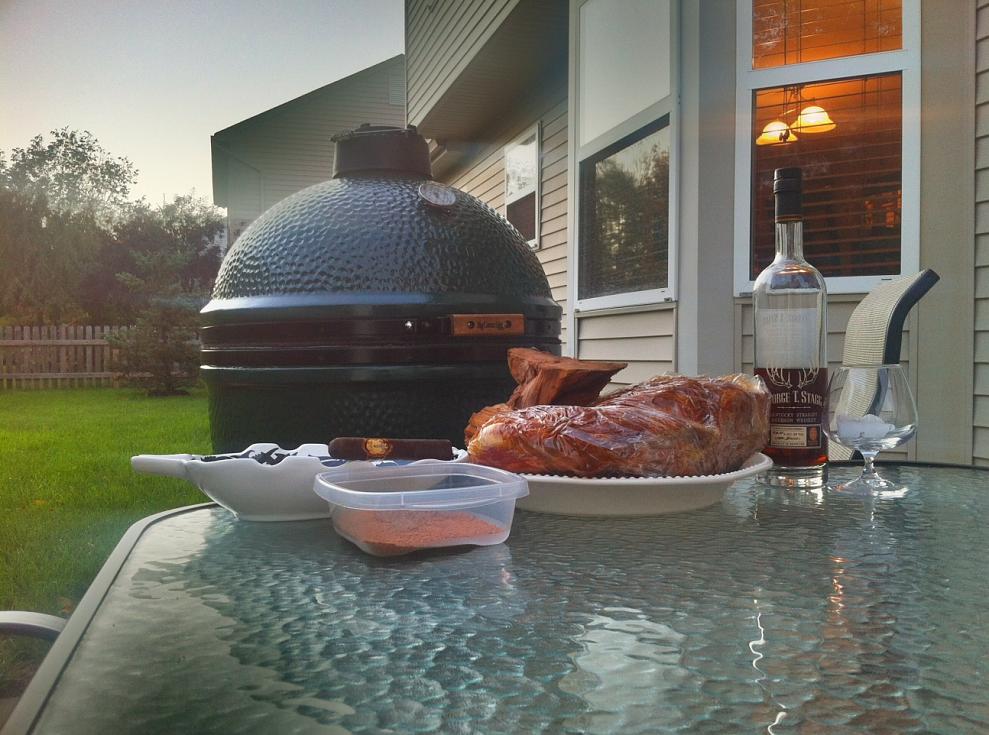 Got the box back to the house this evening and spent some time putting together the stand and the egg itself. It's all ready to rock! Afterwards I went out and picked up a cover for it, a few bags of wood chunks (hickory, oak, and cherry), and a 9lb bone in pork shoulder.