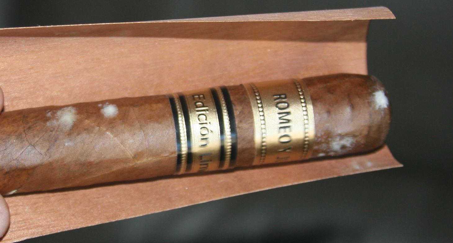 I opened the first and found a spot of mold on one so I picked up the phone and called the 800 number on the invoice. The lady was polite and immediately set out to get a return label to me and another sampler sent my way. After hanging up I opened the other one and found mold on ~half of the gars. I called back and spoke with someone else. He asked me what color the spots were and as soon as I said "white" he immediately flew into a "That's not mold that's...". Hold the phone hoss, I've seen plume, and I've seen mold in many places on many things. They look nothing alike and I'm not a dummy, despite how I may look. I offered to send pictures and they gladly accepted them. Here's the reply "Thank you for your email. My manager, supervisor, and myself all took a look at the pictures you have provided and we can confirm definitely that is in fact plum (bloom) and not mold. Mold would be green or bluish and when you wipe it off the cigar it would leave a stain and can rip the wrap because the mold would seep into the wrapper itself. If you wipe what you have on the cigar right now off, there should be no stain and the wrap will be intact. We have all confirmed what you have is simply plum. You can wipe it off and enjoy your cigars. If we had a littlest suspicion it was mold we would immediately inform you to return the cigars." I guess there is no such thing as white mold. Tis impossible for it to grow on tobacco. Some guy on the internet said so. Here's a pic |