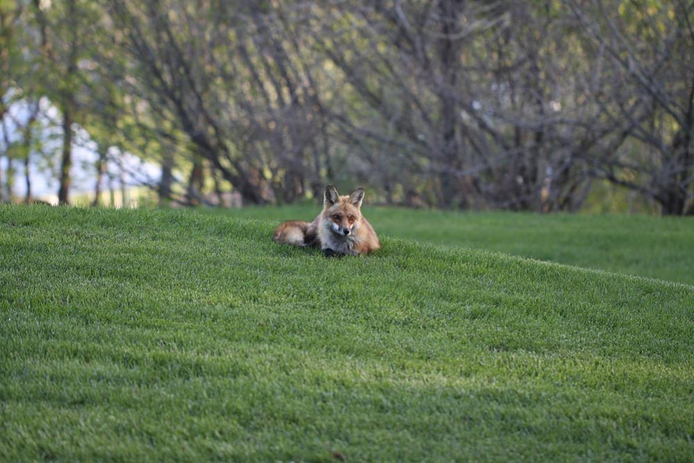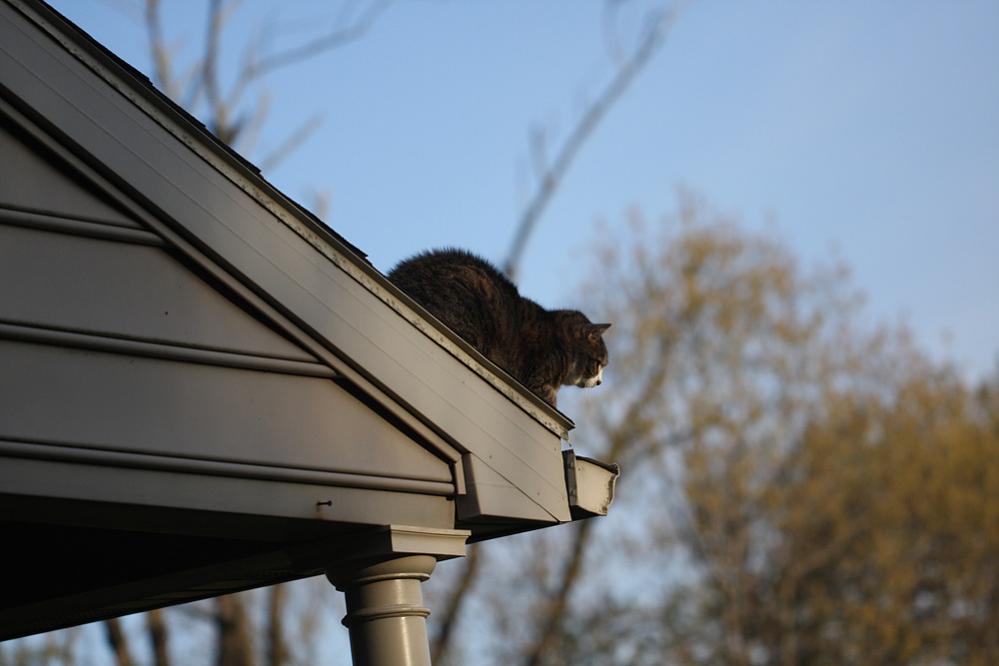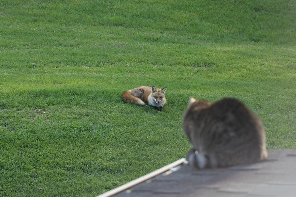 Our cat loves to sit out on our porch roof to survey her domain. The other day this fox came trotting by, and took notice. He stopped after seeing the cat, and started licking his chops, then decided to lay down and have a stare down contest.