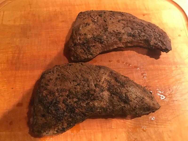 Smoked Paprika Tri Tip INGREDIENTS 1 grass-fed tri tip roast 1 Tbsp smoked paprika 1½ tsp coriander 2 Tbsp dried oregano 1½ Tbsp fresh rosemary, chopped 2 garlic cloves, minced 1½ Tbsp sea salt 2 tsp black pepper, ground 1 Tbsp tallow for searing (I did not have tallow, so I used lard) INSTRUCTIONS Add all spices to a medium sized mixing bowl and combine thoroughly creating the rub. Liberally coat tri tip with the rub ensuring an even coating overall. Let it rest on the counter to allow it to come to room temperature. Heat a large cast iron skillet over high heat for 5 minutes. Once hot, add tallow to skillet and sear tri tip for 5 minutes per side or until a nice crust develops. Place tri tip in vacuum bag and Sous Vide for 6-8 hours at 130° (Medium Rare). Normally, I sear the meat after taking it out of the bath, but since I seared these before the bath, I skipped the post-bath sear. It was very tasty! After applying the rub: After searing: In the Bath: After the Bath: All sliced up: