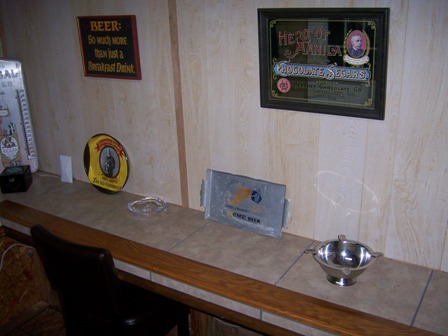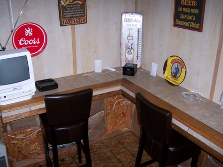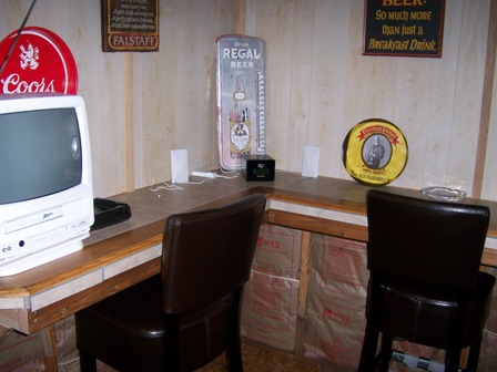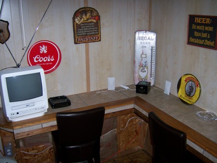 OK! Did some more work on the interior of the shed the last couple of weeks. I'm almost totally finished but still need to complete the wiring for the outlets and then finish up that last bit of paneling. But I finished my "bar" and got some decorations up and even have a small TV in there now! I had five guys in there last Sunday, for cigars, chili, and homebrew! Except for being a bit smokey it was pretty comfortable! Here are the latest pics!