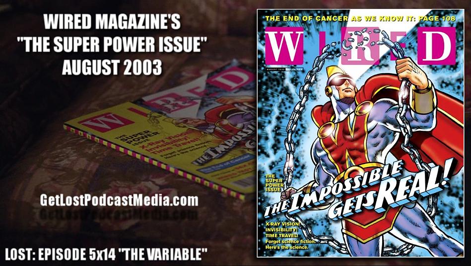 1. Wired Magazine: See attached photo. The copy of the magazine Wired that was on Faraday's couch when Widmore visited him. It was the August 2003 issue - ''The Super-Powers Issue'' - devoted to the plausible science behind far-fetched stuff like invisibility, X-ray vision, and time travel. The headline: ''The Impossible Gets Real!'' The issue discussed two time travel theories favored by most LOST fans, Throne Plates and Kerr Rings. There's also this cover-touted article, ''The End of Cancer As We Know It,'' which can be found on...Page 108. Cancer, of course, has haunted LOST since season 1; and 108 is the sum total of all LOST's numbers (4, 8, 15, 16, 23, 42).