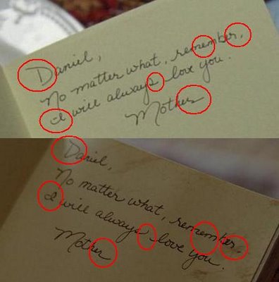 9. Faraday's notebook: The inscription from Eloise is different the 2 times we see it. See attached. Probably just a duplicate prop to look older but I wanted to mention it anyway since someone went to the trouble to point out the differences.