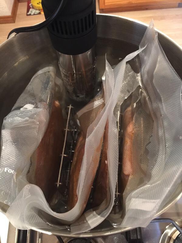 I put up some flank steaks this morning (two pieces, that I had to cut in half to fit into my sous vide stock pot -- It's a 20 quart pot, but only 12" in diameter).