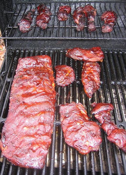 plus a pack of about 8-9 western style ribs. Those damn things are tastier than freaking ribs to me. Ray's has just been slathered on and we are about to go to the glazing operation. Put a couple of taters in there, too |