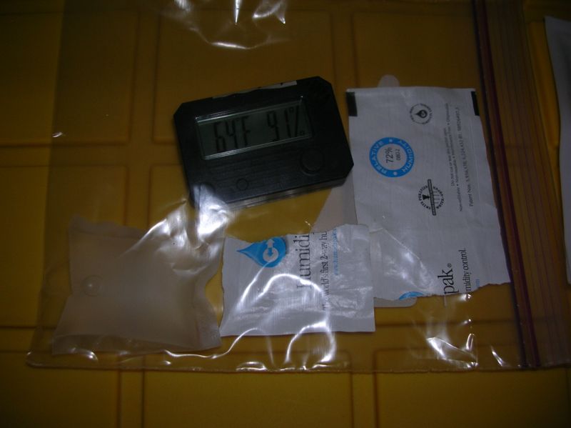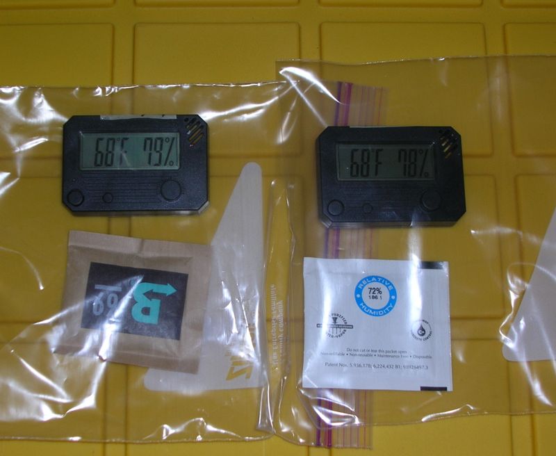75% calibration pack*: 8.1g failed label 72%**: 29.4g Pack 1 (72% from previous photo): 10.5g Pack 2 (69% from previous photo): 16.8g Pack 3 (69% almost crunchy pack now in bag with hygro): 6.1g Pack 4 (72% crunchy pack): 3.3g *: has been in use for 10-12 days now in the supplied bag, 3 hygrometers calibrated **: has been sitting out for a few days Weights measured with 500g x 0.1g digital scale. I'll retest the humidity on the packs when they drop down to around 8g or 9g. |
