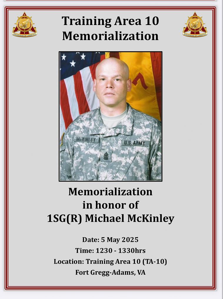 The dedication ceremony for Mac's plak will be May 5th at Fort Gregg Adams training area 10 at 12:30.