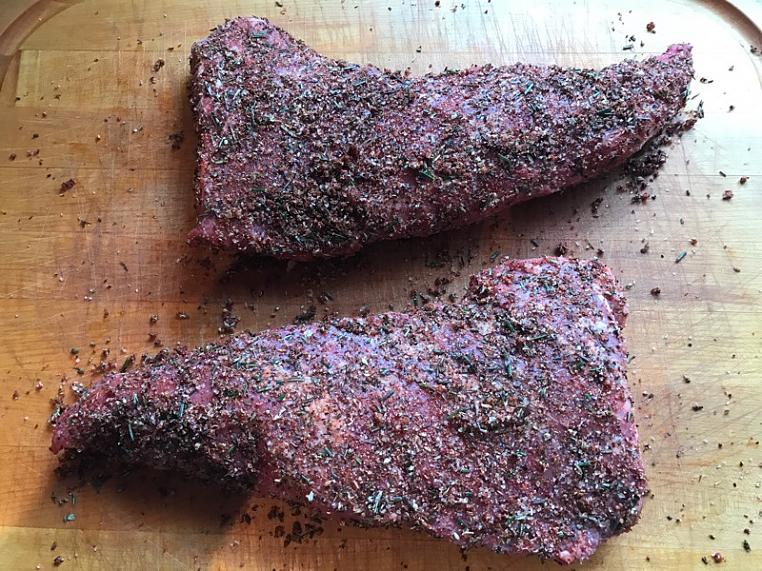 No pics, but did a NY strip steak Saturday. I bought the whole, uncut piece, about 6.5lbs. Was able to get 5, 2 finger width steaks out of it.