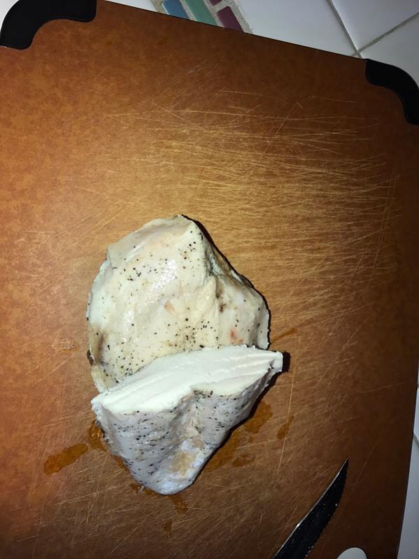 I did 3 boneless, skinless chicken breasts with a little EVOO, salt, pepper and sprig of rosemary for 90 minutes at 146°.