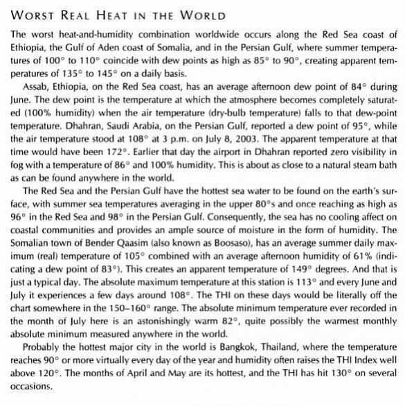 Example 99 degrees without humidity is much cooler than 99 degrees with 60% humudity yet, the temperature will remain the same. Found this and it makes sense that it wouldn't be accurate for everybody however it still makes more sense than straight temperature readings. I do see how somebody could argue either side: Measurements have been taken based on subjective descriptions of how hot subjects feel for a given temperature and humidity, allowing an index to be made which relates one temperature and humidity combination to another at a higher temperature in drier air. The heat index contains assumptions about the human body mass and height, clothing, amount of physical activity, thickness of blood, sunlight and ultraviolet radiation exposure, and the wind speed. Significant deviations from these will result in heat index values which do not accurately reflect the perceived temperature.