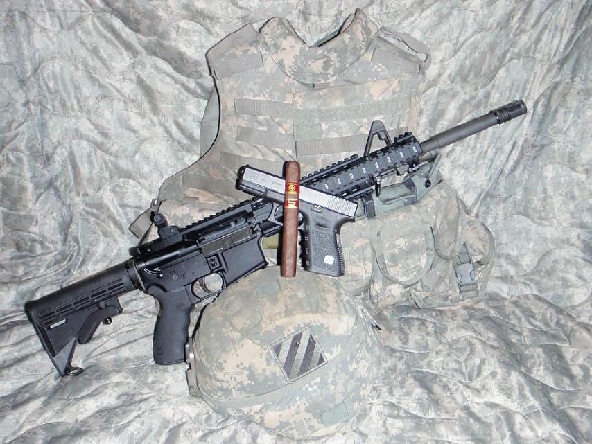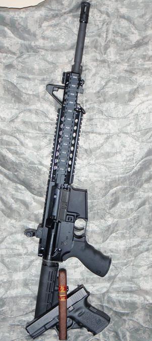 Which brand of AR is that? I can't tell if that is a 16 or 20" barrel. I am going to guess a 20". Also, is that a Hogue oversized rubber grip?Is that a GLOCK 27? |