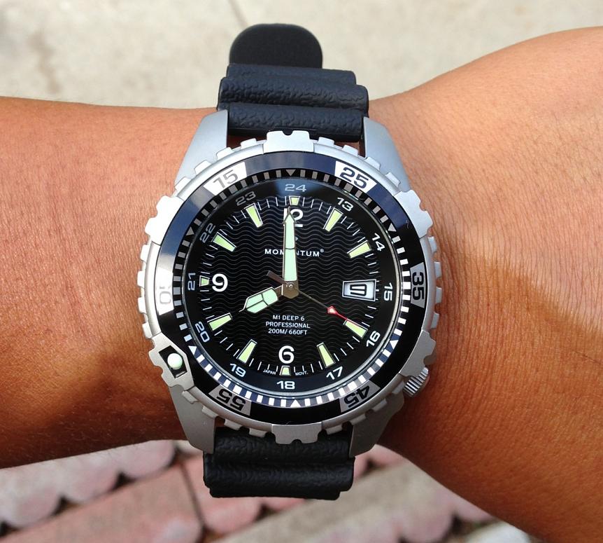 I was in the market for a new large quartz diver (for cheap) I found this Momentum M1 Deep 6 200m diver that fit the bill, I have had the Momentum/St. Moritz brand in the past and found them to be nice watches for the $$$. This one cost me $129 and free shipping. 48mmx56mmx13mm