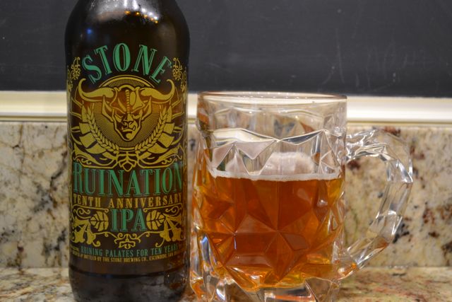It's a good beer standing on its own. However it doesn't seem all that much like Ruination. Ruination is this dry, bitter beer that's all buttering hops. I guess to get the higher alcohol in the 10th they had to increase the malt to an extent that it is more noticeable - the overall balance changes from utter imbalance to something not quite as extreme. Again it's a good beer, just not what I was imagining. I'd say it reminds me more of Lagunitas Maximus than of regular Ruination.