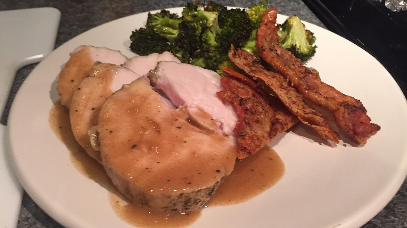 Sous vide turkey breast, gravy (made stock from carcass), roasted broccoli (tossed with rendered turkey fat from skin), skin cracklings. Love my new toy.