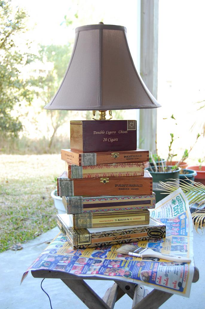 I made this recently from some boxes. Glued the boxes together and got the wiring and shade from lowes. I was going to give it away but I think I can make some better ones. It lights the "bar" in the garage. Come on over for a smoke and a cold one.