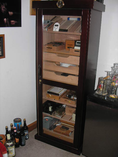 So last Friday the 29th of October I picked up my Sentinel cabinet humidor at UPS freight . I brought it home and got it into my house with a hand truck , a bit cumbersome and listed at 182 lbs on the receipt . The box made it really seem huge and was packed very well . The cabinet was packed in styrofoam inside a box that had another layer of styrofoam around it inside a second box . I checked the cabinet over and everything was in good shape . After wrestling it into a corner I began to set up my new Hydra LG electronic humidifier , fished the power adapter cord through the back and hooked it to the ribbon cable connector . I filled the Hydra water tank and let it soak a while and then poured off the excess . Soaked the 12 humidifiers that came with the cabinet also for seasoning it . I placed 3 hygrometers inside the cabinet on different shelves . Early readings were about 53% without any humidification inside . I hooked up the Hydra and it's reading was way off from my hygro's so I salt tested the 3 hygro's . 1 was dead on , 1 was low by 1% and the 3rd was high by 5%(getting rid of it) . Which meant the Hydra was off also so I adjusted the Hydra to get it closer to 2 of my Western Caliber III hygros . I then pumped up the Hydra to about 75% for seasoning for 3 days . On Sunday I fixed the slight bow problem with the door . I just added a tension latch inside to hold the top corner of the door closed and flush . Monday I brought the setting back down to 65% to see how long it will take to come down . Eventually I'm going to remove the foam from the brick humidifiers and replace it with Heartfelt beads . I ordered a pound on Saturday(they were in my mail box on Monday) to add to the 2 lbs I already have in my coolers . From past experience with the beads it's a no brainer to add them to my cabinet . Exterior measurements are 68-1/2 inches tall x 26-1/4 inches wide x 17-3/4 inches deep , interior - 65 inches tall x 22-3/4 inches wide x 15-1/2 inches deep . 2 drawers , 3 angled shelves and 3 flat shelves of which none are adjustable(I plan on changing that) . Won the humidor from cigarbid.com for $433.00 + $249.00 shipping and still saved about $175.00 from the cheapest place I could find it to buy out right . Here's a picture . I'll post more of my experience with this set up in the near future .