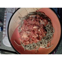 1 can Albacore Tuna_drained Sliced garlic_ your taste Crushed red pepper_ your taste 2 cans Diced tomatoes w olive oil & garlic (hunts or delmonte) spaghetti of choice_ I like a sturdy pasta to hold the sauce Brown sliced garlic & pepper(DO NOT BURN) in a tad of Olive Oil. Add cans of tomatoes and 1 can of water. Bring to a boil to reduce the liquid about 10 min, then reduce to a simmer. While the sauce is cooking boil your noodles & drain until sauce is ready. I usually use a potato masher to smash the tomatoes up for more of a sauce texture. Your choice. Now I add the Tuna and mix with the sauce. You don't need to cook long, or you can cook long. Personal preference. Spoon on top of the pasta & enjoy. Oh, top with fresh grated romano cheese! I know it sounds weird, but it is OH SO GOOD!!!!!! Just give it a try! |