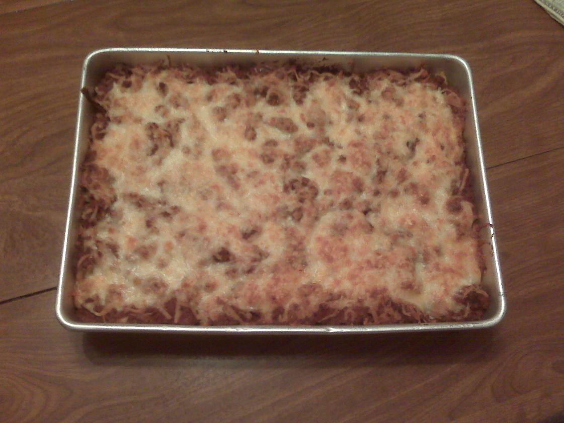 Instructions: Preheat the oven to 375 degrees. Boil the box of noodles according to the directions on the box and drain. Brown the ground chuck and drain off the "drippings". Add the spaghetti sauce, tomato paste, and the garlic salt (more garlic salt can be added if you like the "garlicy" taste). Let it simmer for about 10 minutes. Spread the noodles on the bottom of a 9" x 13" pan, then spread the meat mixture evenly on top of the noodles. Sprinkle the mozzarella cheese, as much as you like, on top of the meat mixture. Bake for about 25 minutes or until the cheese is golden brown. Let the pan sit for about 10 minutes before serving. Enjoy!