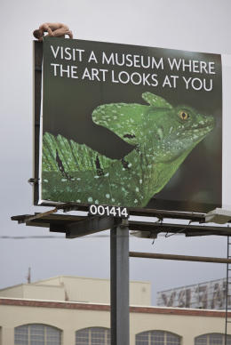 I love the juxtaposition of nude lunatic with the sign on the billboard,