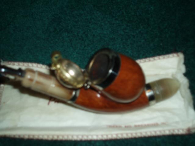 I have a friend who collects stuff and he showed me these two pipes and I am wondering if anyone can help me out with what kind they are and how much they are worth. he would sell them he just doesn't know how much for. he said that these are the bags they came with but the top one looks more like a Tyrolean type and I can't find any pictures that match it. Thanks in advance for your help